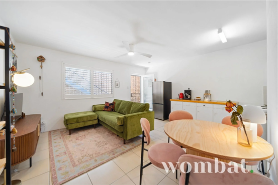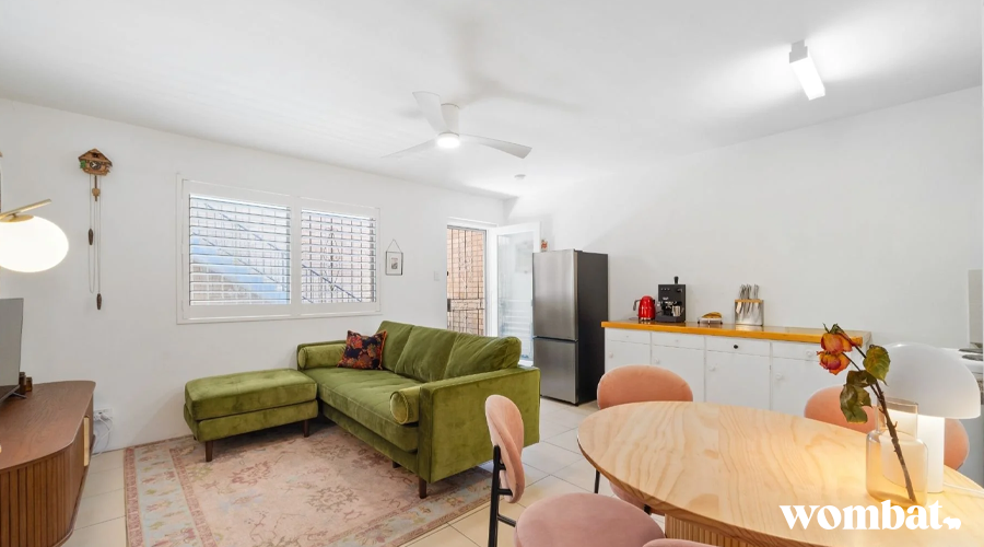 The open-plan living area feels cosy and private with security screens and shutters to allow for natural light and airflow and a ceiling fan with remote